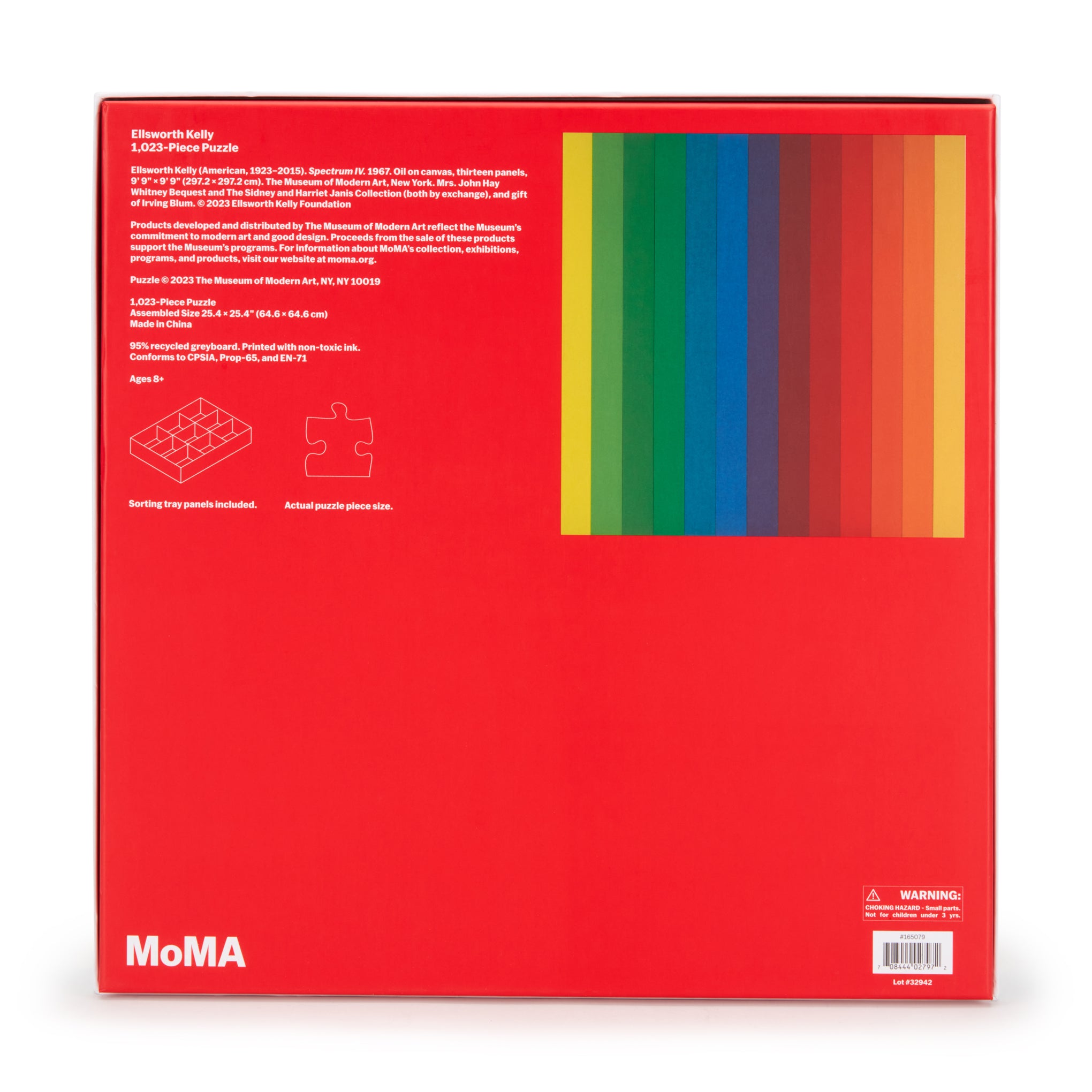 This puzzle includes a unique easy-to-assemble nine-compartment sorting tray for organizing the puzzle pieces inside the box. Made from 95% recycled greyboard and printed with non-toxic ink. The 1,023-piece Ellsworth Kelly Spectrum IV Jigsaw Puzzle measures 25.45l x 25.45”w when assembled.