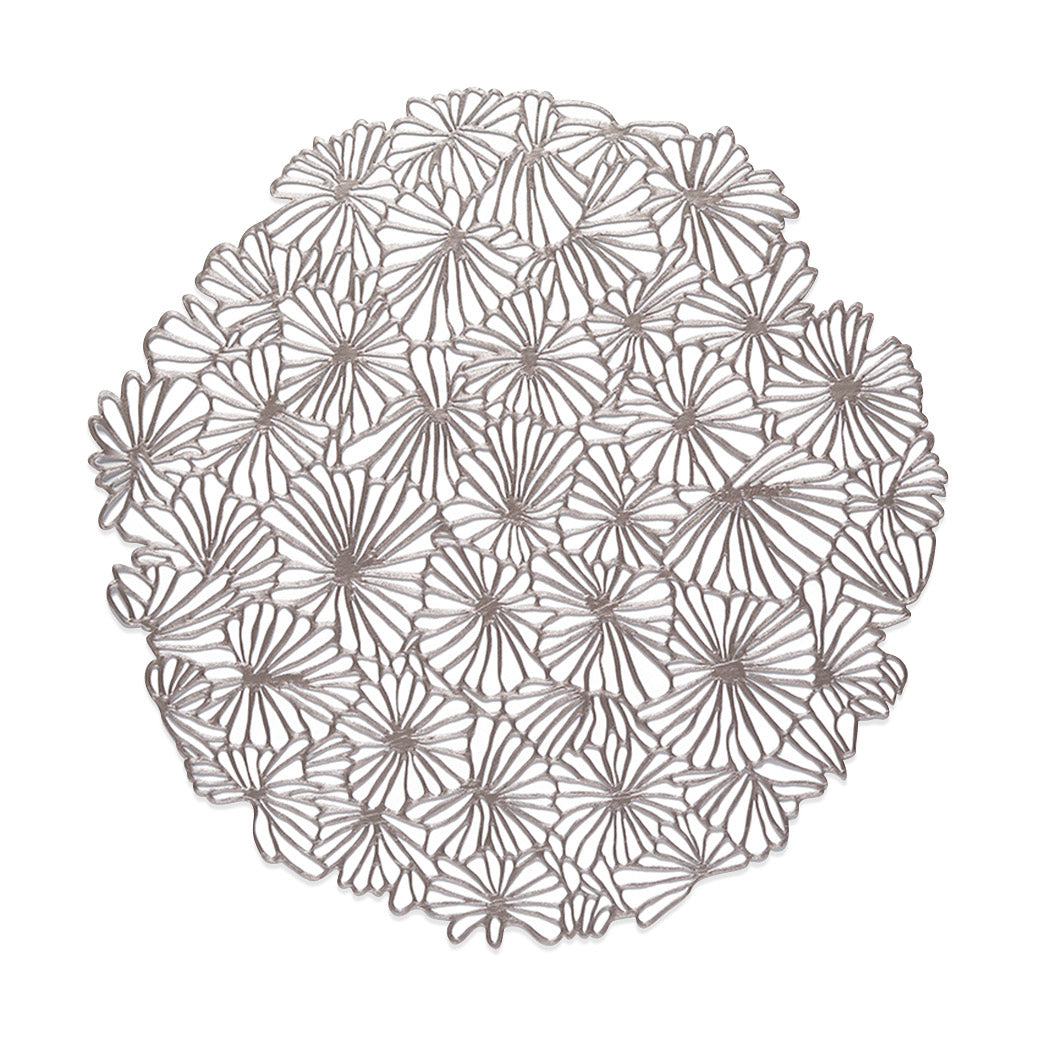 The illusion of a tightly clustered bouquet of daisies viewed from above is created by this flexible, open-work placemat from Chilewich. Delicate in appearance, yet resilient thanks to its molded vinyl yarn material, the Daisy Round Placemat is a modern interpretation of both classic florals and the ancient craft of lacemaking. The placemat becomes a decorative base for whatever is placed on top of it, from a dinner plate to a vase, and is a beautiful way to dress up your dining room table. The Daisy Round Placemat measures 14”diam. Clean with a damp cloth.