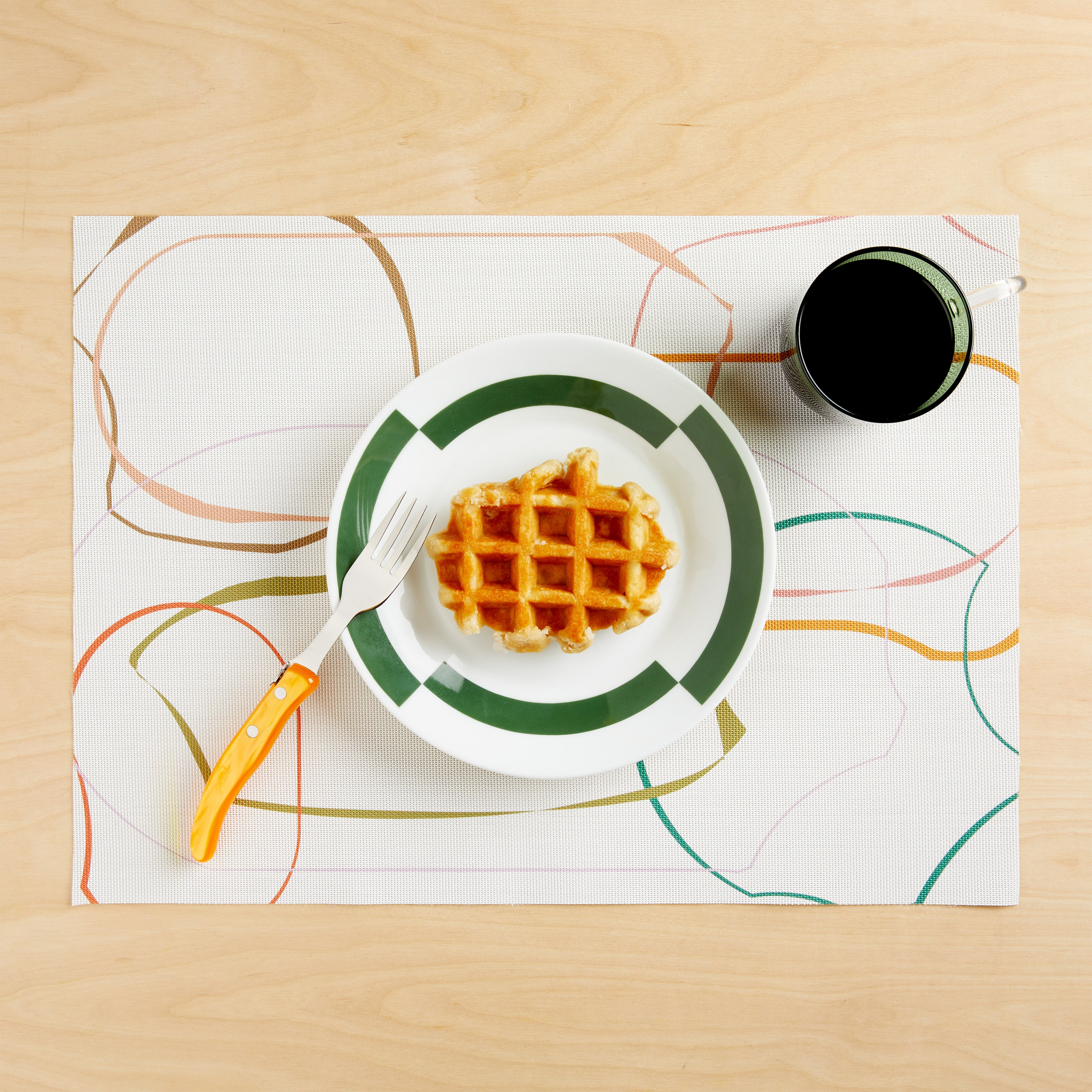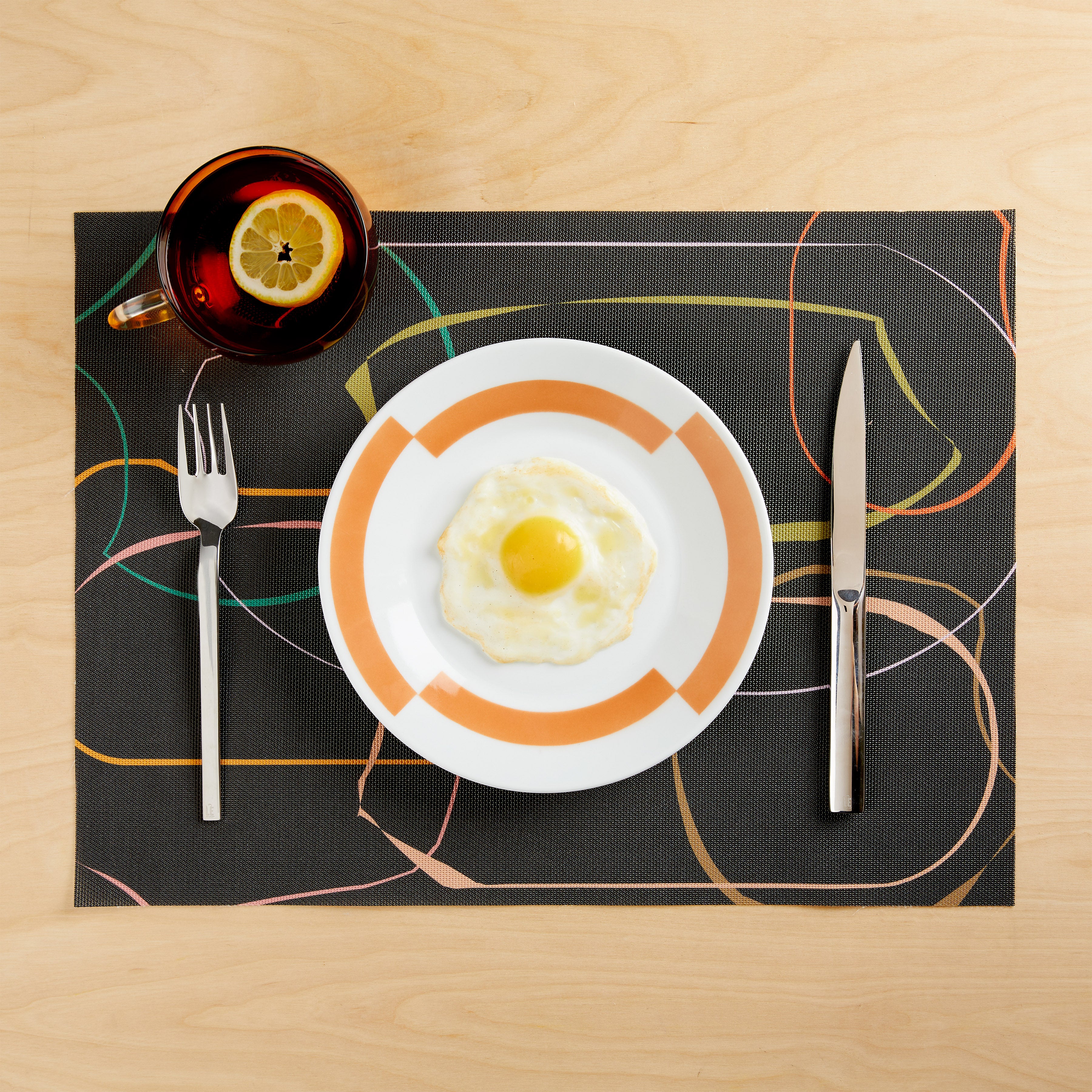 MoMA Exclusive: Created exclusively for our customers, the Chilewich Outline Placemat is inspired by table objects and the dynamic nature of dining. What initially appears as an abstraction of graceful curves and organic lines soon reveals its layers. The print was developed through a digital collage process by which the shapes of plates and platters were overlaid and juxtaposed to create a variety of unique, asymmetrical forms. These compositions of solid shapes were then adjusted to leave only their traces: softened frames that move weightlessly through monochrome space. The Chilewich Outline Placemat is made in the USA from 100% phthalate-free terrastrand yarns with 25% renewable vegetable content. It measures 14l x 19”w. Clean with a damp cloth.