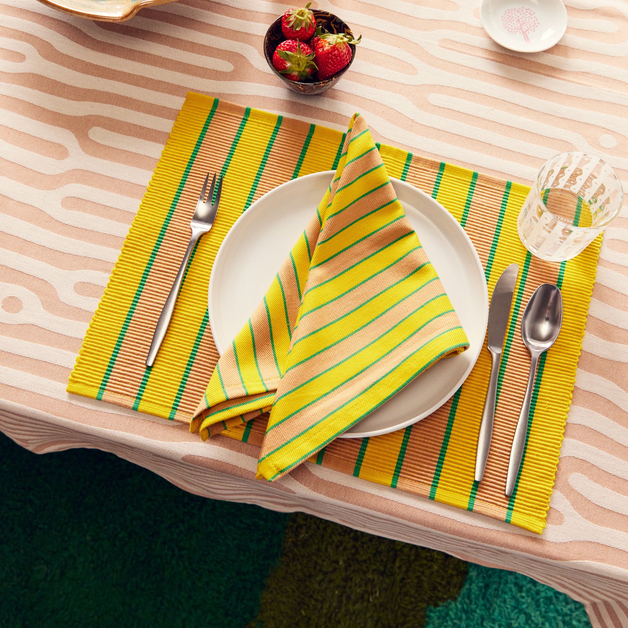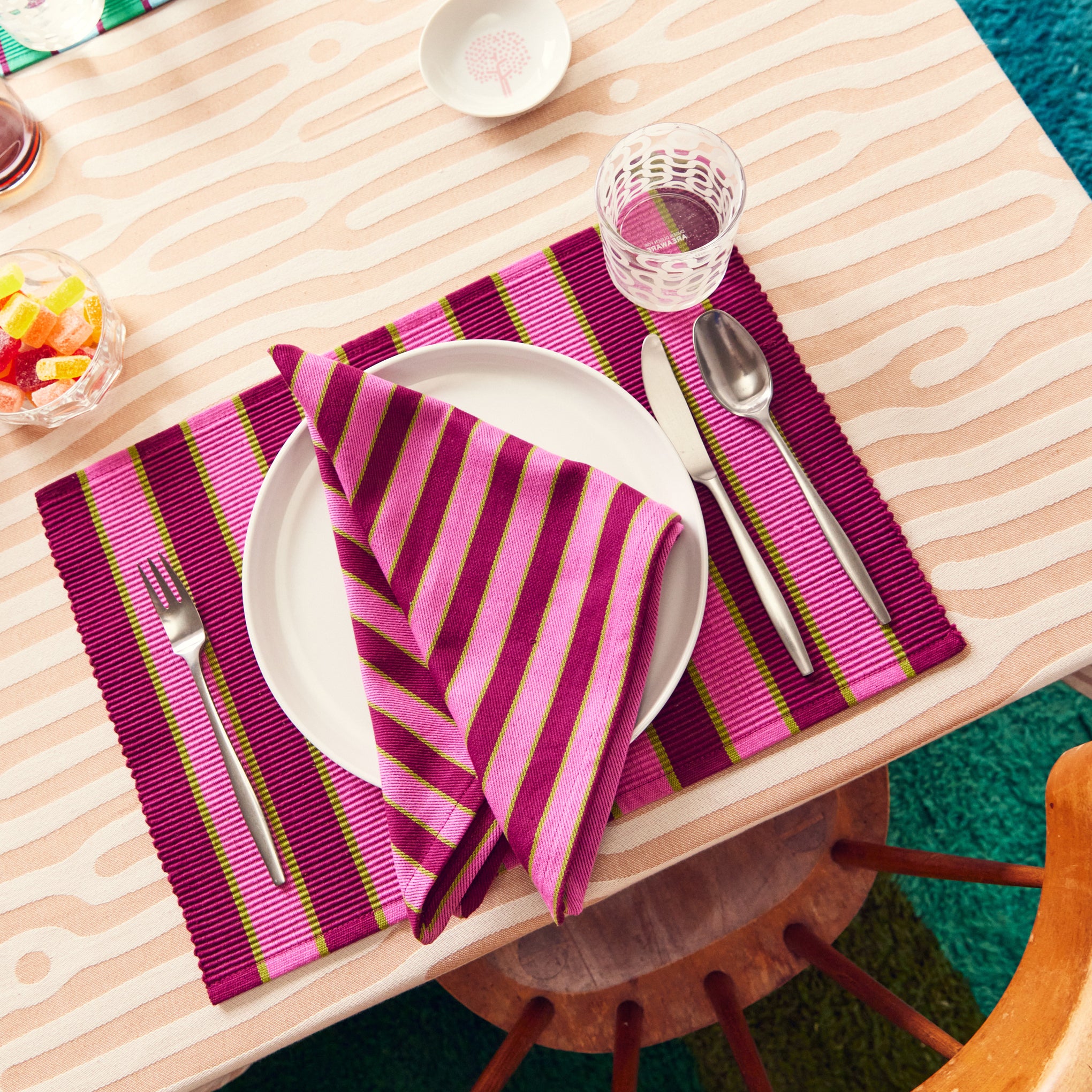 Brooklyn-based designer Ellen Van Dusen employs her keen eye for stripes and color combinations—she approaches stripes as if they were math problems—and applies them to vibrant designs for mealtimes. Made from cotton using a jacquard weave, this set of four Dusen Dusen Stripe Placemats will bring energy and optimism to any table. Each Dusen Dusen Stripe Placemat measures 12l x 18"w. Machine-wash cold, tumble-dry low or hand-wash and lay flat to dry.