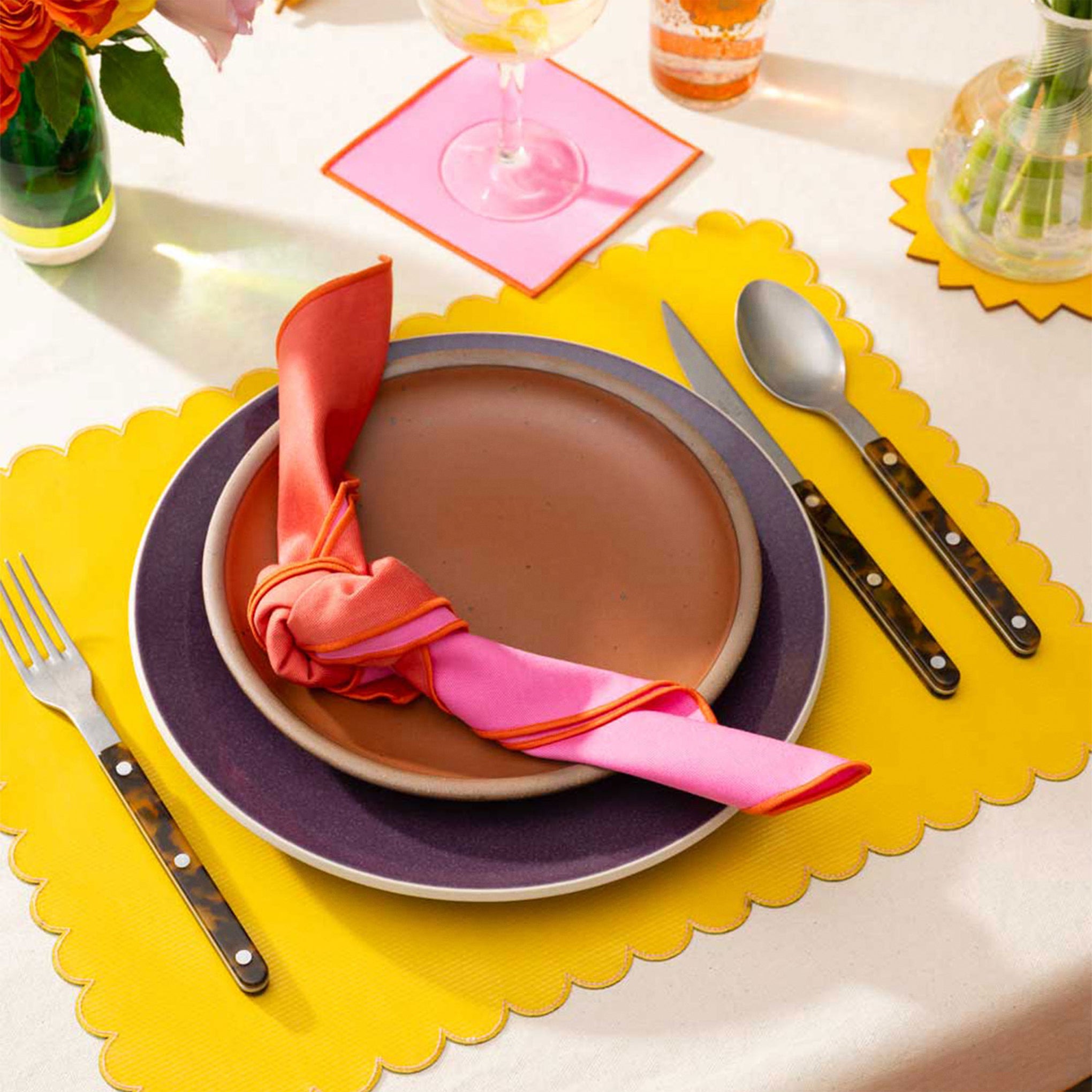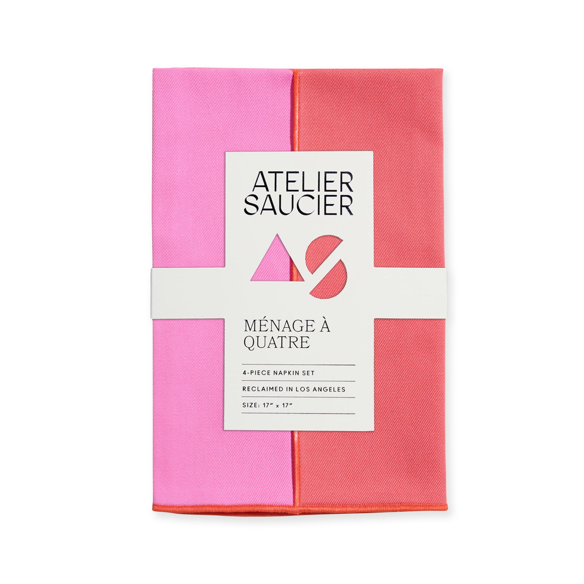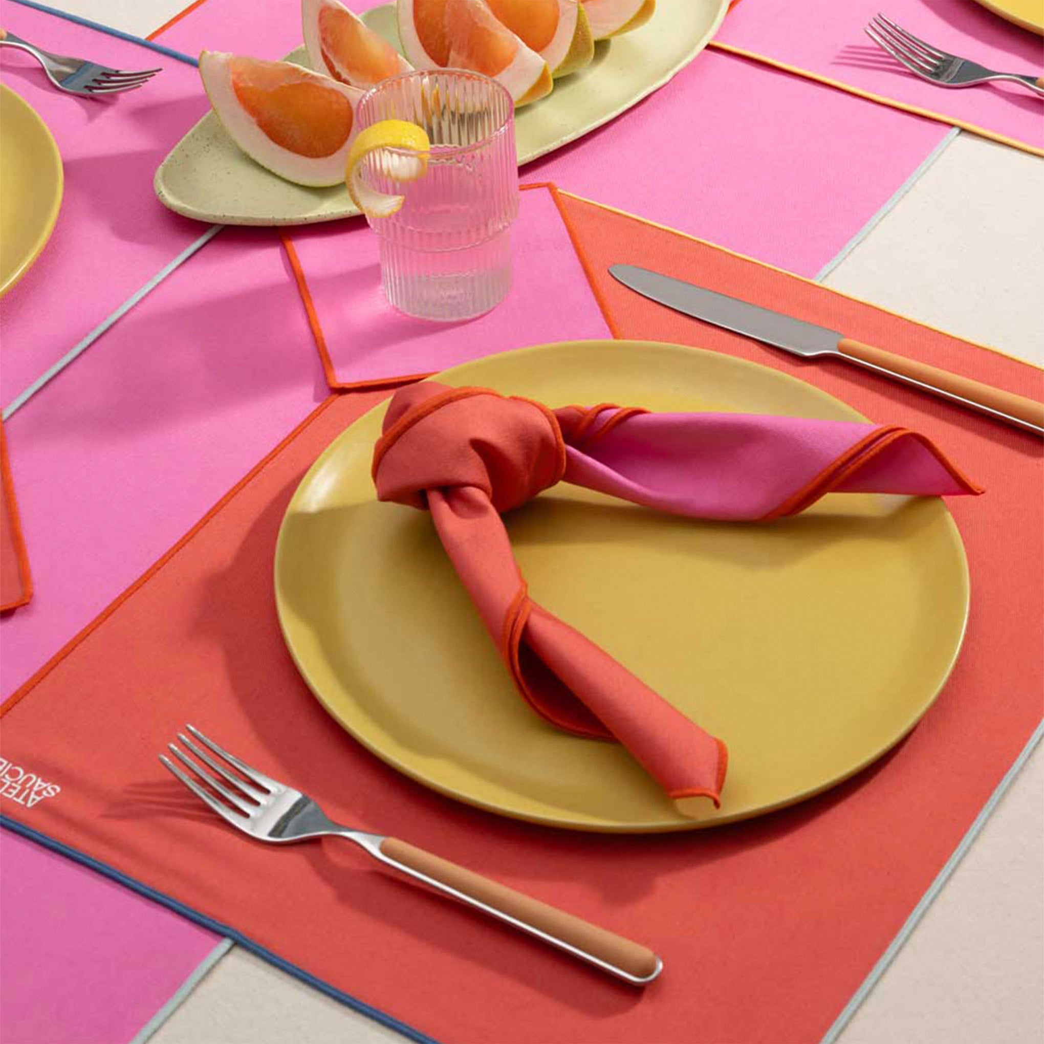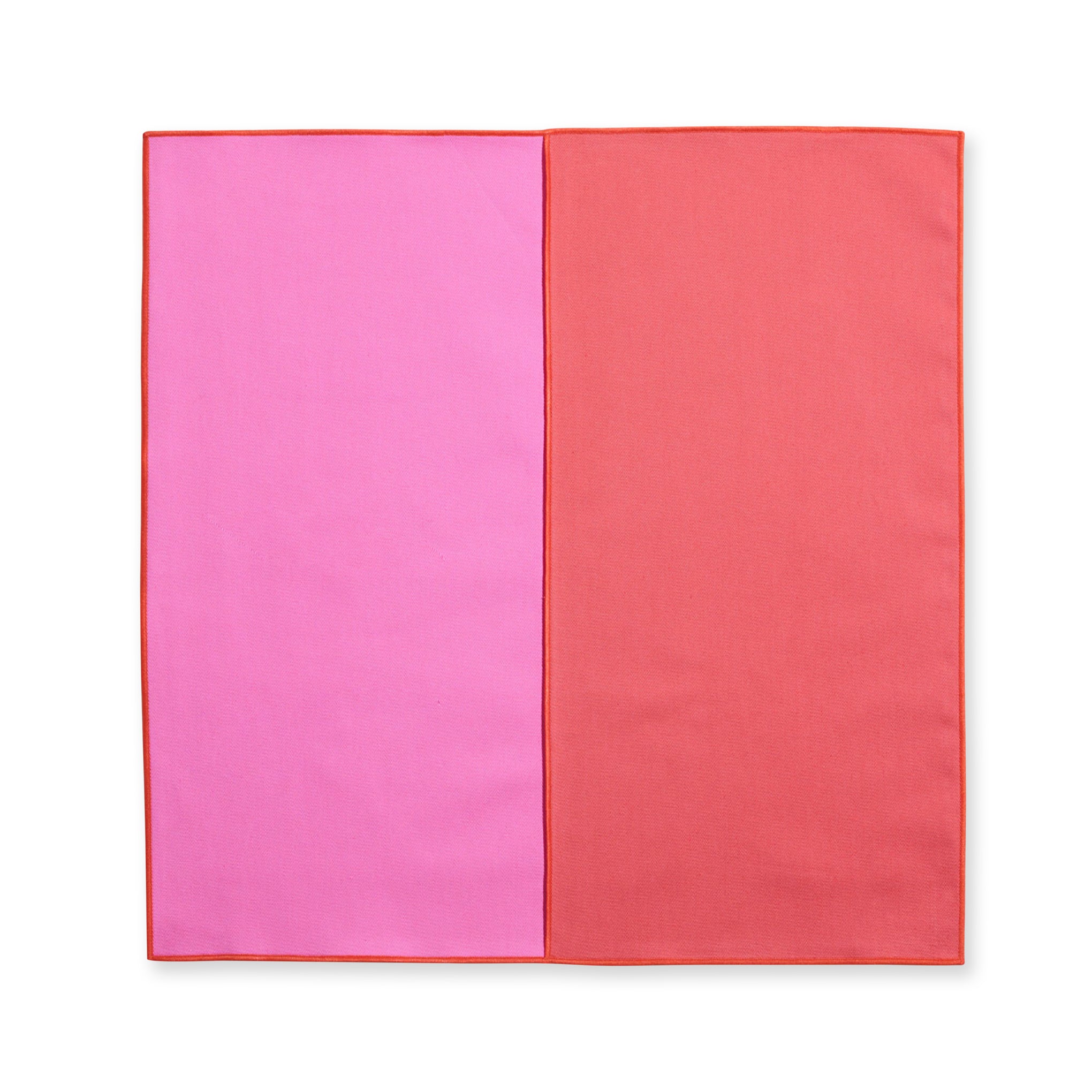Crafted in Los Angeles from 100% premium reclaimed fabric, these twill Lollipop Napkins bring the high-energy hues of your favorite lollipop flavors to your table. Each napkin in this set of four is a two-tone design, half hibiscus pink and half tangerine orange. They’re made to be folded, twisted and knotted for endless variations of table-setting fun. Each of these reusable Lollipop Reclaimed Fabric Napkins measures 17l x 17”w. To care, wash cold, hang dry and press with low iron while damp.