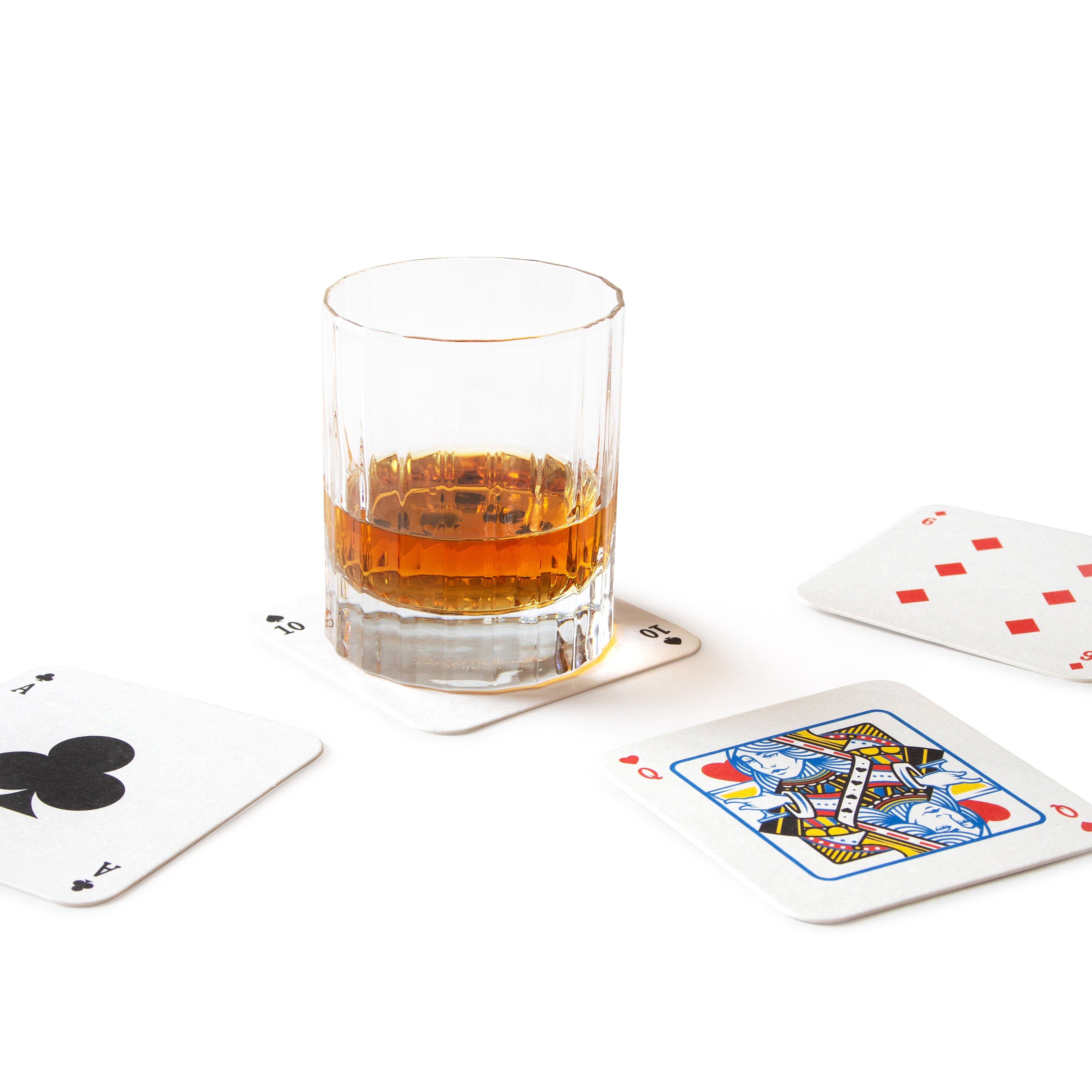 Gin Rummy takes on a new meaning with these paper cocktail coasters printed on the front and back to resemble a full deck of 52 classic playing cards (plus two jokers). Each card has a beverage motif hidden within the design which can make for a fun parlor game. The coasters can also be used to play any card game of your choosing. (The unique design of each card also provides a handy way of identifying your drink at a party or social gathering.) The cards and packaging are made from plastic-free paper pulp, making them fully recyclable. Each Playing Card Paper Coaster measures 3.5"sq. Examples of coasters are represented in MoMA’s collection with Masayuki Kurokawa’s 1975 neoprene designs.