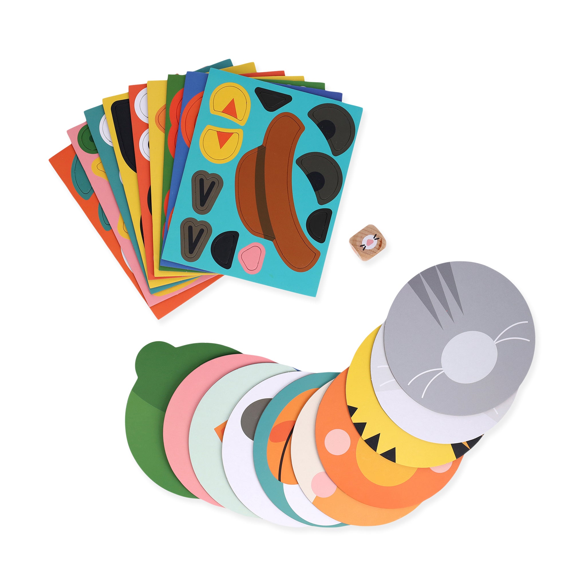 Perfect for fun with family or friends, this simple game lets you choose an animal face to build, and then take turns rolling the die to determine which feature or accessory you’ll add to it. Already have that piece? Try again on your next turn! Keep rolling until you’ve completed your animal, then take another face and start again. The first player to finish three funny faces is the winner — but if you’re short on time, you can always try to make three faces at once. Two to three players ages 4 and up will have a great time learning patience, focus, color and shape recognition and problem-solving skills. Packaged in a 7.15h x 5.85w x 2.2”d box made using 75% recycled materials, the Make Funny Faces Game includes 10 animal faces, 62 feature and accessory pieces, a wooden die, and English, Dutch, French, German, Italian and Spanish instructions, all made from FSC materials and printed with vegetable inks.