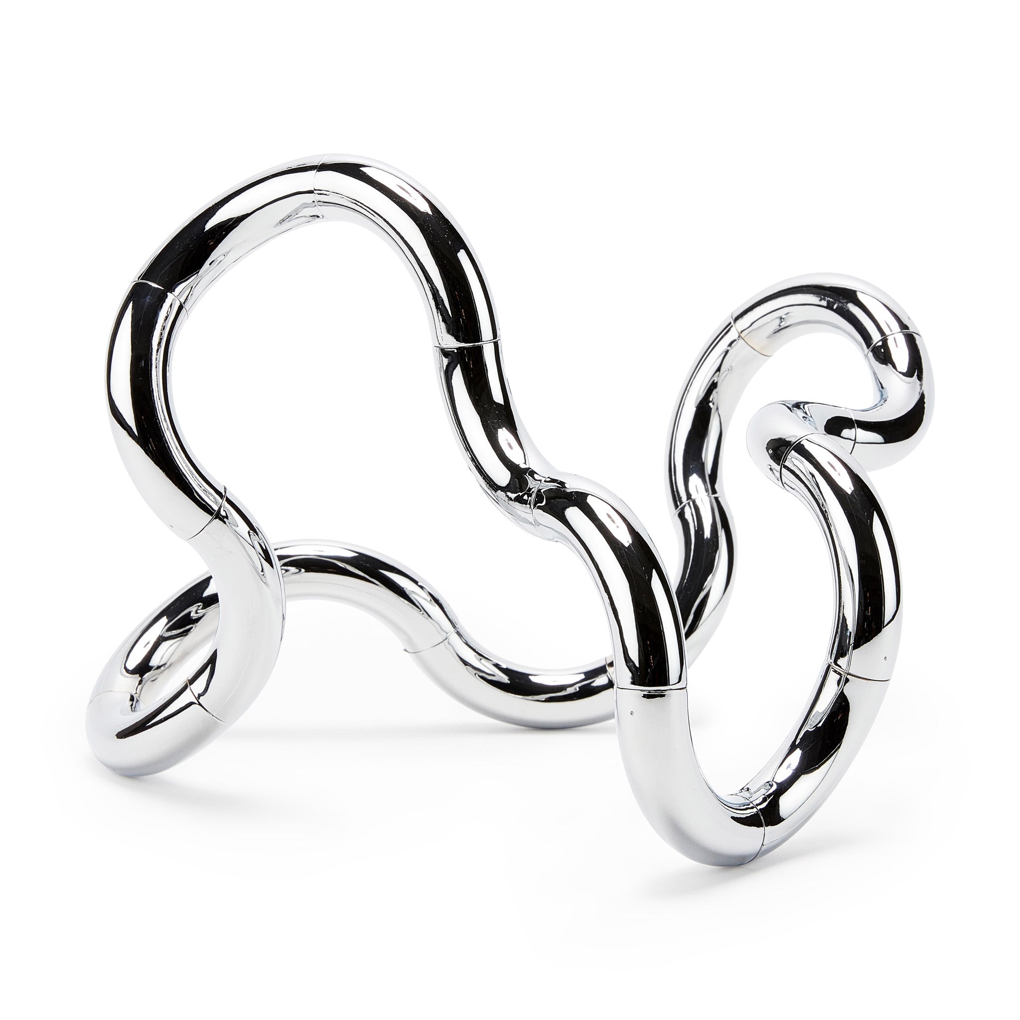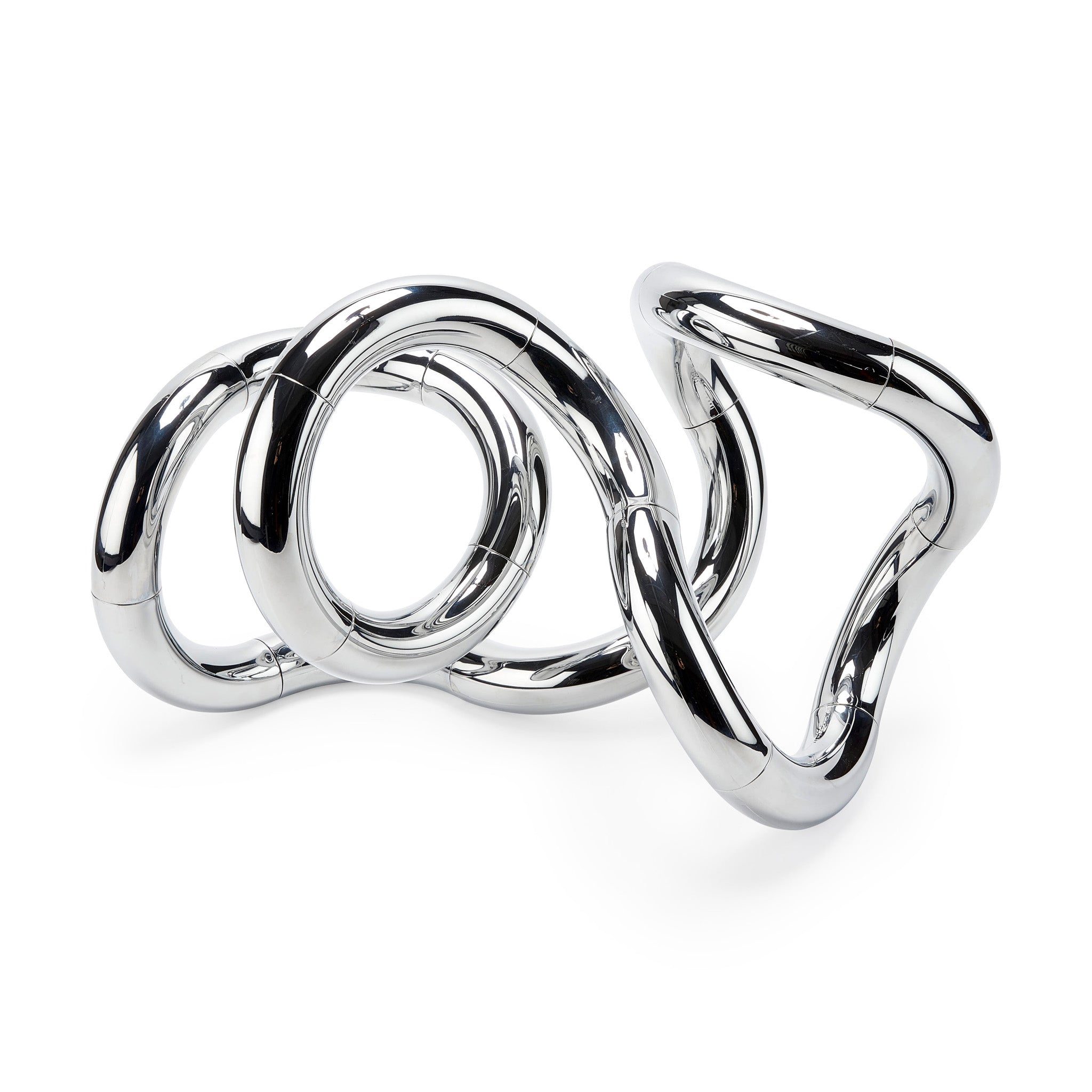 At once a gleaming sculpture and a fascinatingly tactile toy, the Tangle’s curved, chrome-plated segments can be turned and twisted to create an infinite number of sculptures. Inspired by the designer's immersive studies of Asian philosophy and based on the concept of the “endless knot” present in many Eastern cultures and religions, the Tangle Chrome Objets invite both reflection and participation from everyone who views them. The smaller Tangle Chrome, expandable to 12”, makes an excellent companion on your desk or worktable, and the larger Tangle Chrome Museum, expandable to 2’, works well as a centerpiece in a workroom, dining room or conference room. To clean, wipe with a mild soap.
