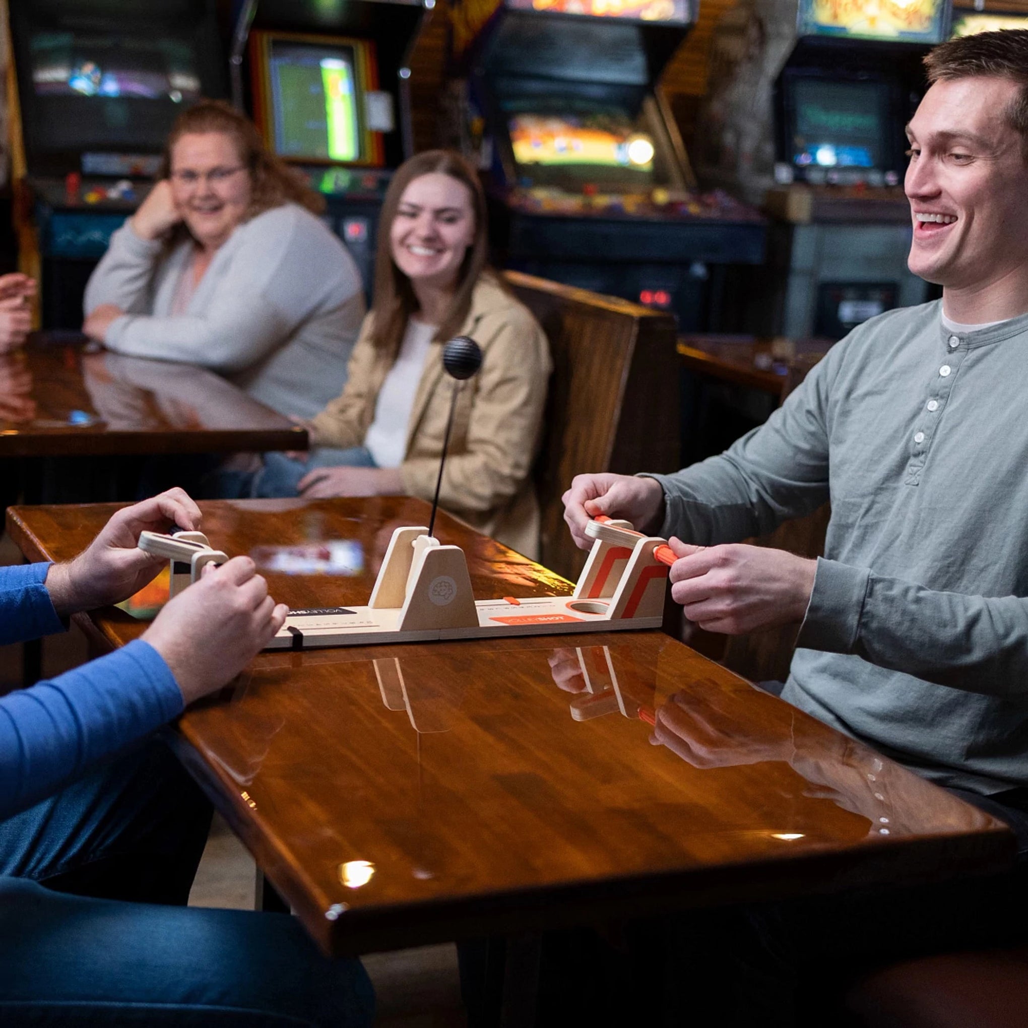 A new design for game night! In this two-player Volley Shot game each person operates a paddle, knocking a ball attached to a rod back and forth until someone misses. Every miss is a point for your opponent and the game requires you to stay focused and steady. The game encourages hand-eye coordination and concentration. Made from high-quality solid wood parts, the Volleyshot Toy measures 8.5h x 12.5w x 2.25"d. Ages 8+.